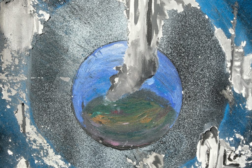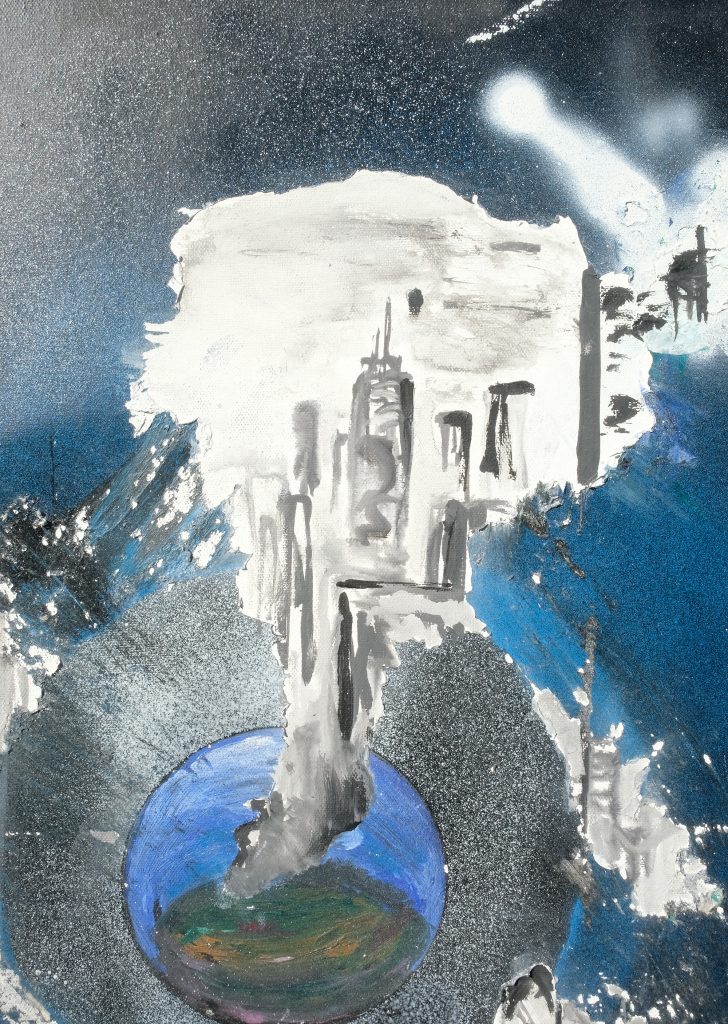 Die Malerei zeigt in einer Mischung aus Spray – und Acrylfarbe eine Stadt im Hintergrund eines abstrakten Vordergrundes.