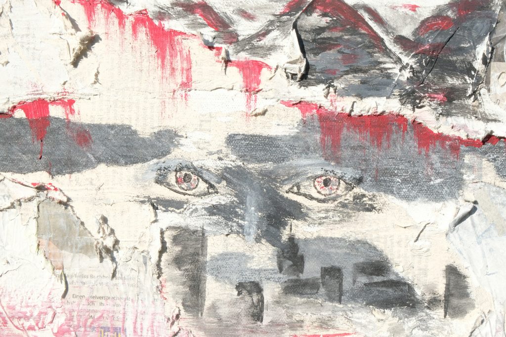 Die Collage zeigt einen urbanen und ländlichen Hintergrund verbunden mit Augen auf Grundlage von Zeitungspapier.